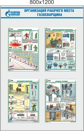 Стенд Организация рабочего места газосварщика, 4 плаката осуэло А3 (800х1200; Пластик ПВХ 4 мм; Алюминиевый профиль)