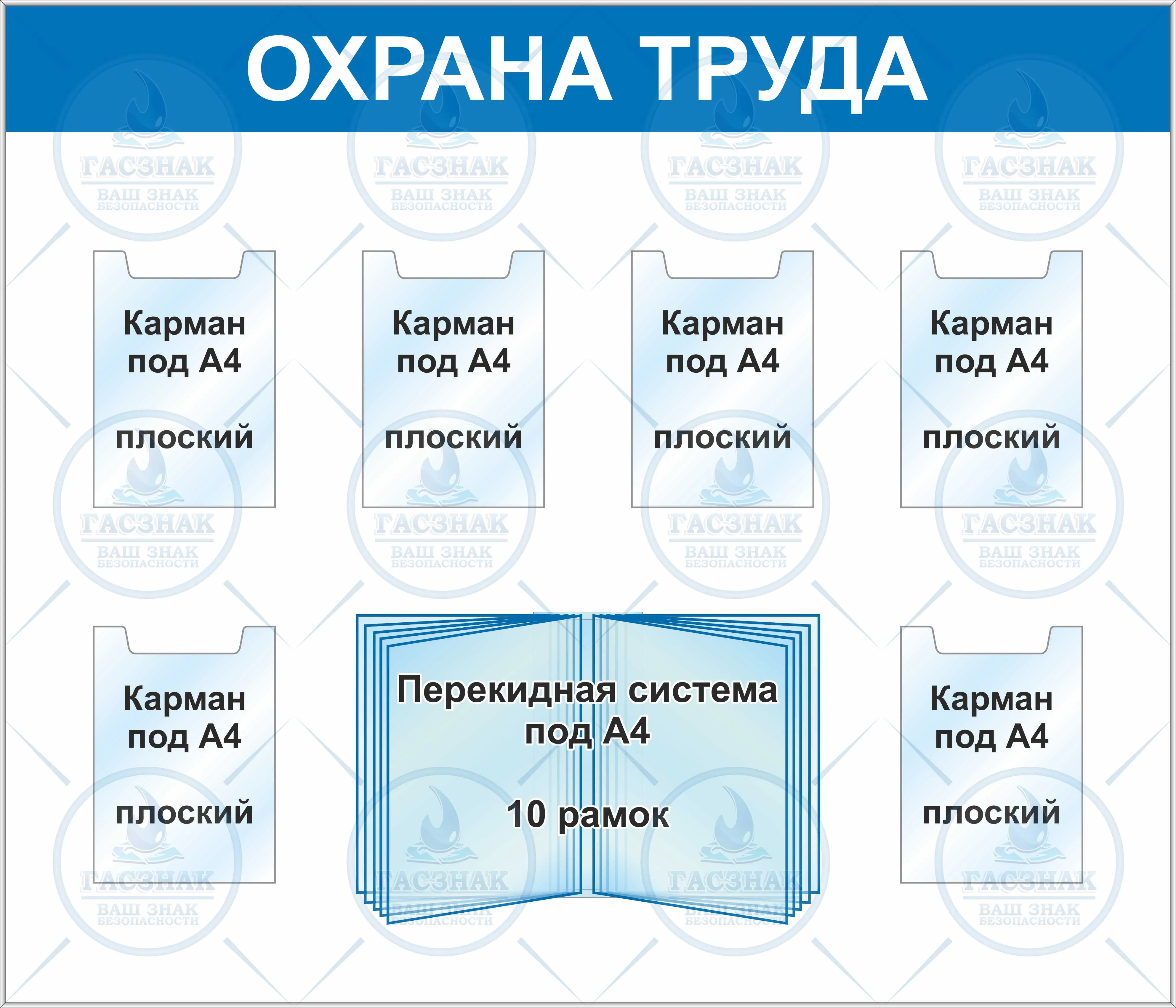 Стенд Охрана труда, алюминиевый профиль, 6 плоских карманов А4, перекидная система А4 10 листов (Пластик ПВХ 4 мм; 1400х1200) Номенклатура (код): ЦБ-00012076 Характеристика: Охрана труда (6 карманов A4 плоских вертик., перекидная система A4 на 10 рамок вертик.) Код характеристики: Стенд Охрана труда (no name)