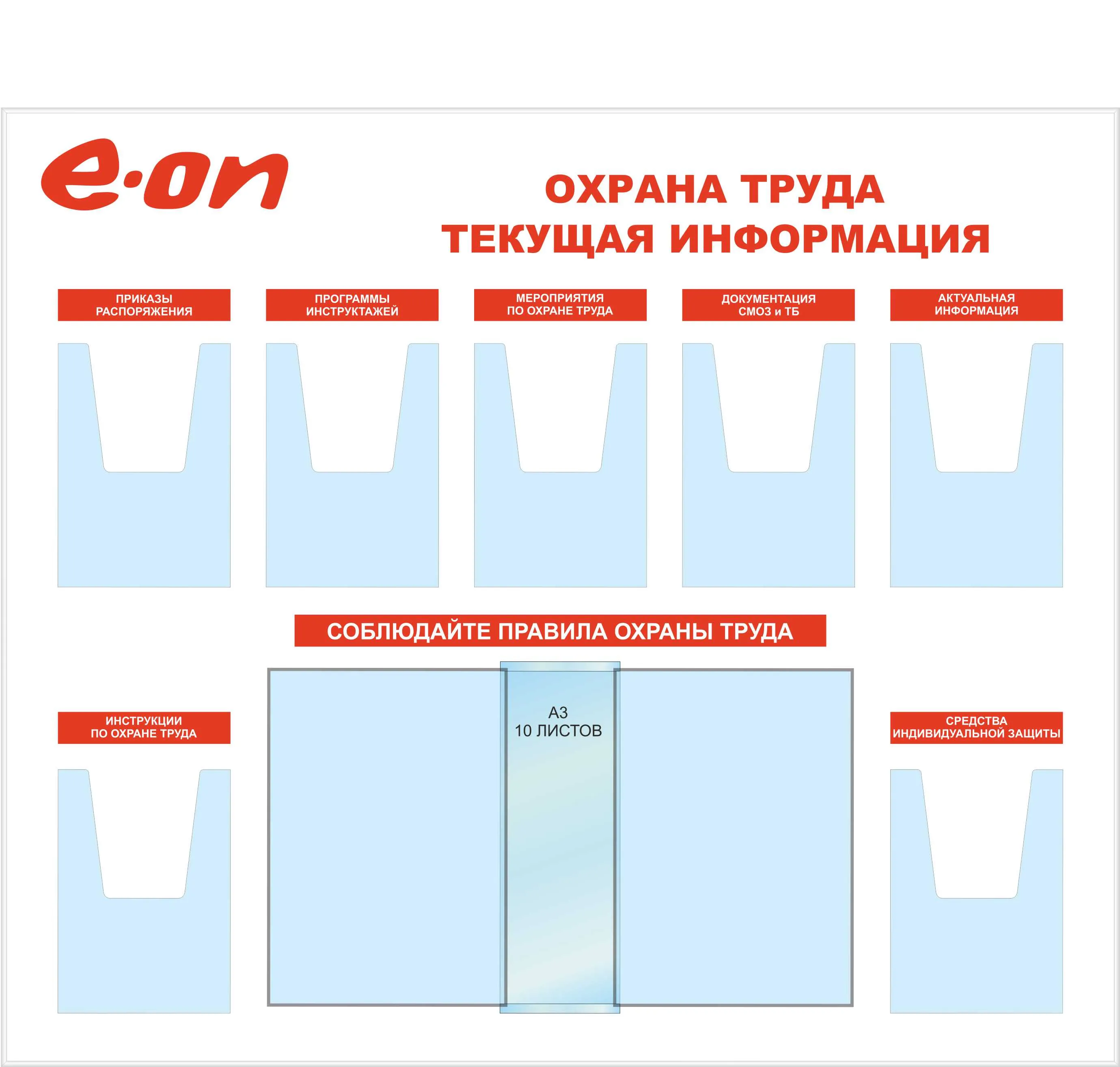 Стенд - Охрана труда. Карман объемный А4-7шт, перекидное устройство А3 на 10 рамок (1400х1200; Пластик ПВХ 4 мм, пластиковый профиль)