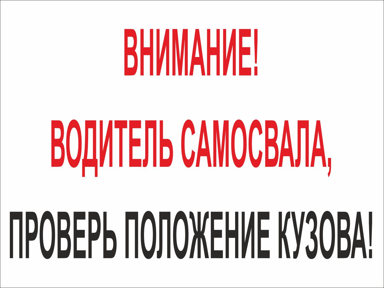 Знак. Внимание! Водитель самосвала проверь положение кузова (отбортовка "коробочка" с креплением к эстакаде) (800х600; Металл 0,8 мм оцинкованный, световозвращающая пленка типа А микропризматическая ГОСТ Р 52290-2024; )Продукция произведена на территории Российской Федерации и соответствует критериям подтверждения российского происхождения согласно Постановлению Правительства РФ № 719. Номера реестровых записей: 10651105, 10626803. Код ОКПД 2: 32.99.53.190 и 22.29.29.190.