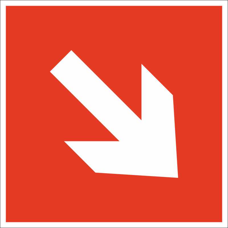 «Направляющая стрелка под углом 45°» относится к группе общих эвакуационных знаков безопасности, которые должны устанавливаться на предприятиях, в офисах и учреждениях для обеспечения пожарной безопасности. Выполняется в виде изображения белой диагональной стрелки на красном фоне. Применяется только в сочетании с другими знаками безопасности. Используется для обозначения направления, в котором следует двигаться, чтобы добраться до места, где хранится огнетушитель, самоспасатель или другое средство противопожарной защиты и тушения пожаров.Продукция произведена на территории Российской Федерации и соответствует критериям подтверждения российского происхождения согласно Постановлению Правительства РФ № 719. Номера реестровых записей: 10651105, 10626803. Код ОКПД 2: 32.99.53.190 и 22.29.29.190.